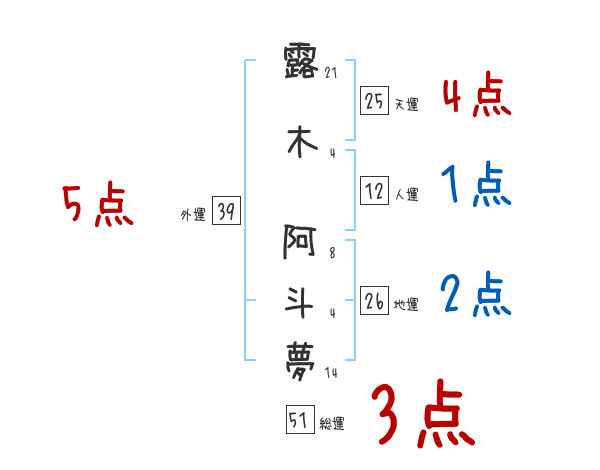外運![]() | 露木阿斗夢さんの外運は39画の5つ星!社交性に優れ人望が厚い。人の上に立ち成功する。 生活面を象徴する運勢です。外部から受ける影響力を表し、結婚運、家庭運や職場、環境への順応性を表します。 |