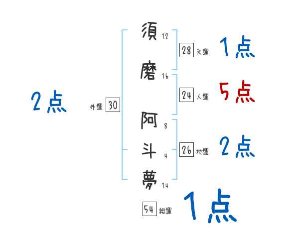 天運![]() | 須磨阿斗夢さんの天運は28画の1つ星!家庭環境に注意。スポーツで活躍できる能力があるかも。 家系が持つ宿命的な運勢を表します。祖先から受け継いだ苗字ですので自分の力が及びません。家柄を象徴します。 |