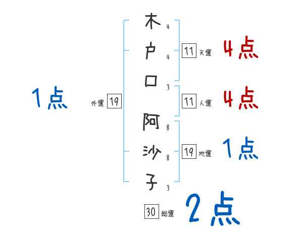 天運![]() | 木戸口阿沙子さんの天運は11画の4つ星!着実に富や地位を得る幸運な人生。 家系が持つ宿命的な運勢を表します。祖先から受け継いだ苗字ですので自分の力が及びません。家柄を象徴します。 |