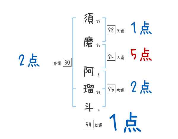 外運![]() | 須磨阿瑠斗さんの外運は30画の2つ星!浮き沈みの激しさに注意しましょう。 生活面を象徴する運勢です。外部から受ける影響力を表し、結婚運、家庭運や職場、環境への順応性を表します。 |