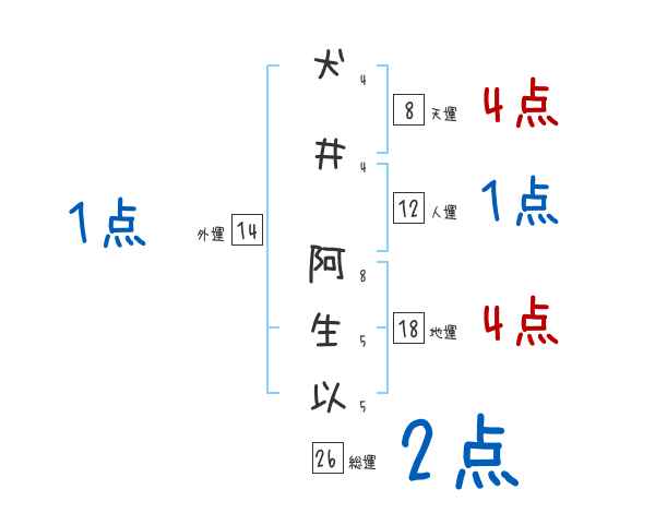 外運![]() | 犬井阿生以さんの外運は14画の1つ星!人に対して優しいがストレスを溜め込みがち。人間関係のトラブルを避けるよう気をつけましょう。 生活面を象徴する運勢です。外部から受ける影響力を表し、結婚運、家庭運や職場、環境への順応性を表します。 |