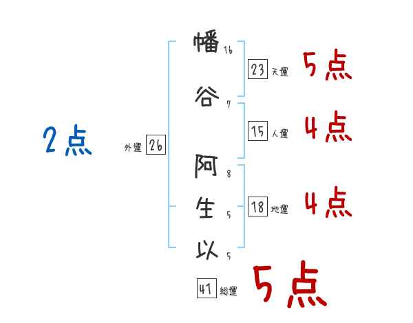 天運![]() | 幡谷阿生以さんの天運は23画の5つ星!想像力に優れ活力がある。一代で成功し名誉を手に入れる。 家系が持つ宿命的な運勢を表します。祖先から受け継いだ苗字ですので自分の力が及びません。家柄を象徴します。 |