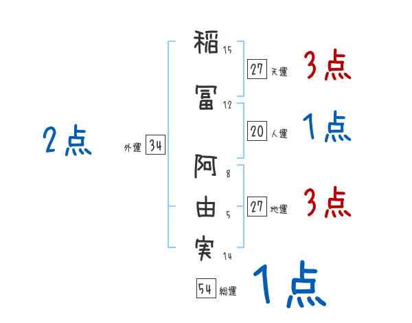 外運![]() | 稲冨阿由実さんの外運は34画の2つ星!独創性に優れるが、自尊心が強く災難に注意しましょう。 生活面を象徴する運勢です。外部から受ける影響力を表し、結婚運、家庭運や職場、環境への順応性を表します。 |