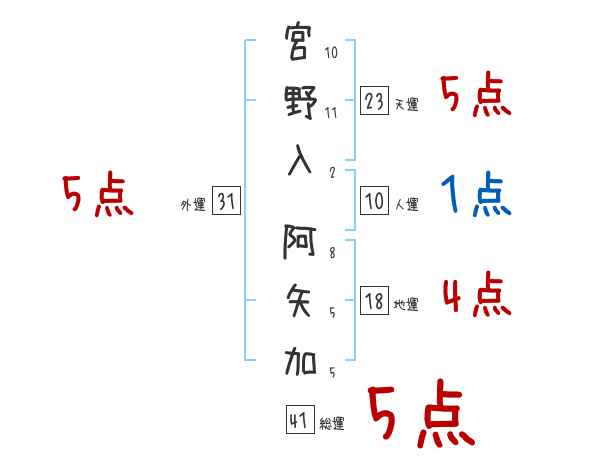 外運![]() | 宮野入阿矢加さんの外運は31画の5つ星!社交性があり判断力に優れる。順風満帆な人生で円満な生活。 生活面を象徴する運勢です。外部から受ける影響力を表し、結婚運、家庭運や職場、環境への順応性を表します。 |