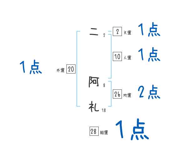 総運![]() | 二阿礼さんの総運は28画の1つ星!家庭環境に注意。スポーツで活躍できる能力があるかも。 あなたの人生を表す1番重要な運勢です。生涯を通じて影響する総合運となり、主に50歳以降の晩年期に影響を及ぼします。 |