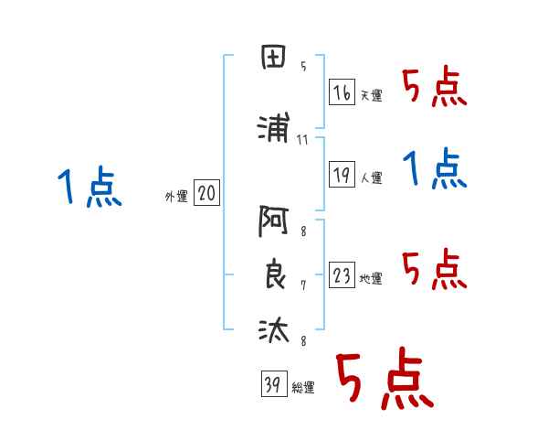 総運![]() | 田浦阿良汰さんの総運は39画の5つ星!社交性に優れ人望が厚い。人の上に立ち成功する。 あなたの人生を表す1番重要な運勢です。生涯を通じて影響する総合運となり、主に50歳以降の晩年期に影響を及ぼします。 |