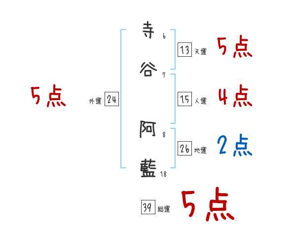 外運![]() | 寺谷阿藍さんの外運は24画の5つ星!家庭運が良く順調な人生。金運にも恵まれる。 生活面を象徴する運勢です。外部から受ける影響力を表し、結婚運、家庭運や職場、環境への順応性を表します。 |