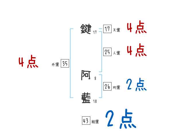 鍵阿藍さんの外運は35画の4つ星