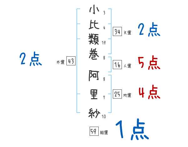 人運![]() | 小比類巻阿里紗さんの人運は16画の5つ星!人望が厚く大きく発展する。逆転成功が見える。 性格や才能などを表す2番目に重要な運勢です。人間関係や協調性、社会的な成功に影響します。主に20歳から50歳ぐらいまでの中年期の運勢を表します。 |
