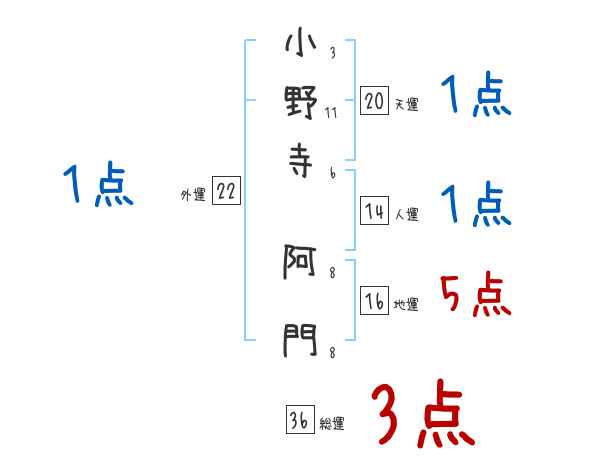 外運![]() | 小野寺阿門さんの外運は22画の1つ星!努力することが苦手ないっぽう手先が器用。芸術性にも優れる。 生活面を象徴する運勢です。外部から受ける影響力を表し、結婚運、家庭運や職場、環境への順応性を表します。 |