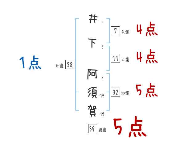 外運![]() | 井下阿須賀さんの外運は28画の1つ星!家庭環境に注意。スポーツで活躍できる能力があるかも。 生活面を象徴する運勢です。外部から受ける影響力を表し、結婚運、家庭運や職場、環境への順応性を表します。 |