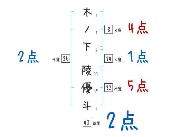 外運![]() | 木ノ下陵優斗さんの外運は26画の2つ星!波瀾万丈かも。信頼できる人を大事にしましょう。 生活面を象徴する運勢です。外部から受ける影響力を表し、結婚運、家庭運や職場、環境への順応性を表します。 |
