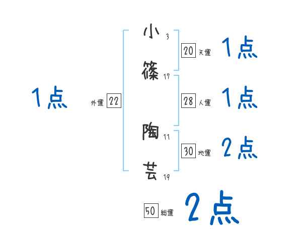外運![]() | 小篠陶芸さんの外運は22画の1つ星!努力することが苦手ないっぽう手先が器用。芸術性にも優れる。 生活面を象徴する運勢です。外部から受ける影響力を表し、結婚運、家庭運や職場、環境への順応性を表します。 |