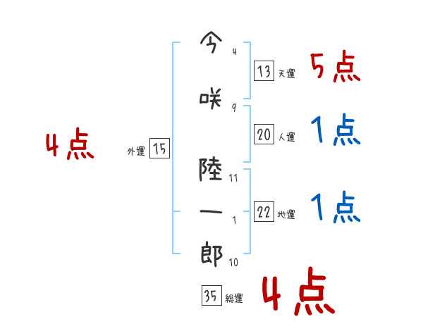 外運![]() | 今咲陸一郎さんの外運は15画の4つ星!人徳があり出世する。順調に物事を進め円満な人生。 生活面を象徴する運勢です。外部から受ける影響力を表し、結婚運、家庭運や職場、環境への順応性を表します。 |