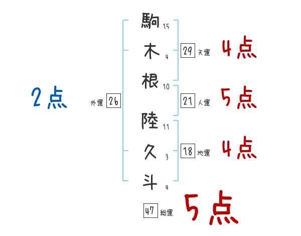 天運![]() | 駒木根陸久斗さんの天運は29画の4つ星!完全主義で才能がある。厳格な心の持ち主。 家系が持つ宿命的な運勢を表します。祖先から受け継いだ苗字ですので自分の力が及びません。家柄を象徴します。 |