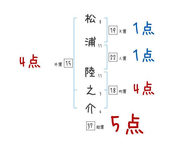 天運![]() | 松浦陸之介さんの天運は19画の1つ星!優れた才能を持ちますが、協調性が足りないことも。周りの人と協力する事を意識しましょう。 家系が持つ宿命的な運勢を表します。祖先から受け継いだ苗字ですので自分の力が及びません。家柄を象徴します。 |