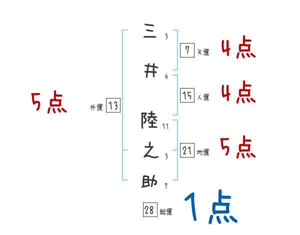 総運![]() | 三井陸之助さんの総運は28画の1つ星!家庭環境に注意。スポーツで活躍できる能力があるかも。 あなたの人生を表す1番重要な運勢です。生涯を通じて影響する総合運となり、主に50歳以降の晩年期に影響を及ぼします。 |