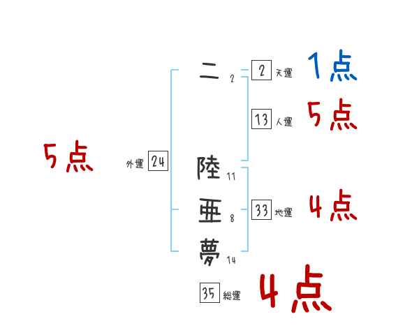 総運![]() | 二陸亜夢さんの総運は35画の4つ星!温厚な性格で感受性が高い。穏和な性格で人望が厚い。 あなたの人生を表す1番重要な運勢です。生涯を通じて影響する総合運となり、主に50歳以降の晩年期に影響を及ぼします。 |