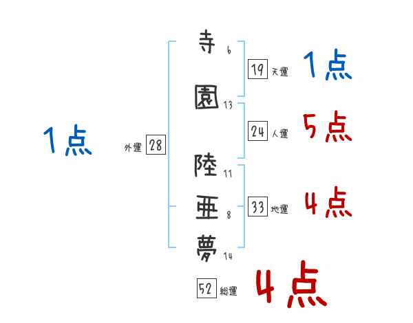 天運![]() | 寺園陸亜夢さんの天運は19画の1つ星!優れた才能を持ちますが、協調性が足りないことも。周りの人と協力する事を意識しましょう。 家系が持つ宿命的な運勢を表します。祖先から受け継いだ苗字ですので自分の力が及びません。家柄を象徴します。 |