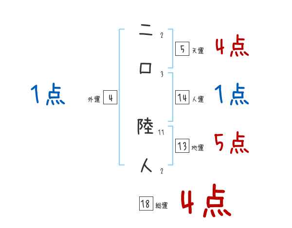 天運![]() | 二口陸人さんの天運は5画の4つ星!健康で安泰。協調性に優れ、財産に恵まれる。 家系が持つ宿命的な運勢を表します。祖先から受け継いだ苗字ですので自分の力が及びません。家柄を象徴します。 |