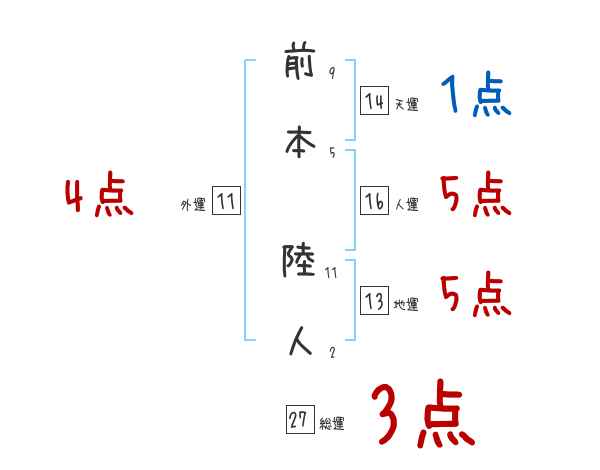 人運![]() | 前本陸人さんの人運は16画の5つ星!人望が厚く大きく発展する。逆転成功が見える。 性格や才能などを表す2番目に重要な運勢です。人間関係や協調性、社会的な成功に影響します。主に20歳から50歳ぐらいまでの中年期の運勢を表します。 |