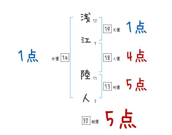 天運![]() | 浅江陸人さんの天運は19画の1つ星!優れた才能を持ちますが、協調性が足りないことも。周りの人と協力する事を意識しましょう。 家系が持つ宿命的な運勢を表します。祖先から受け継いだ苗字ですので自分の力が及びません。家柄を象徴します。 |