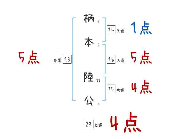 人運![]() | 柄本陸公さんの人運は16画の5つ星!人望が厚く大きく発展する。逆転成功が見える。 性格や才能などを表す2番目に重要な運勢です。人間関係や協調性、社会的な成功に影響します。主に20歳から50歳ぐらいまでの中年期の運勢を表します。 |