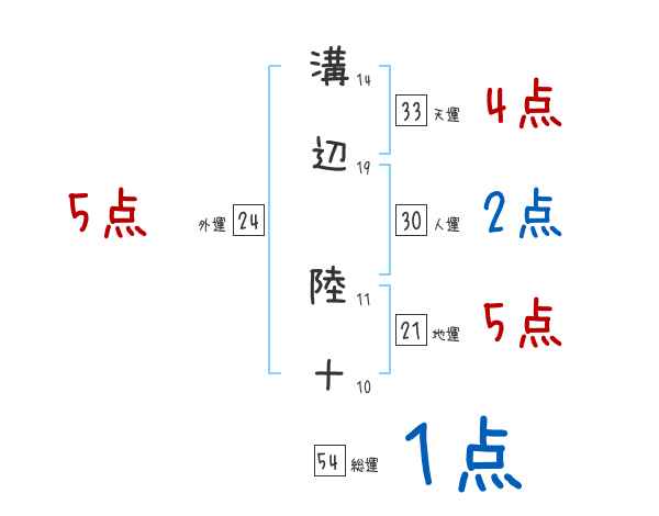 天運![]() | 溝辺陸十さんの天運は33画の4つ星!権力志向でプライドが高い。勇気があり運を切り開き成功する。 家系が持つ宿命的な運勢を表します。祖先から受け継いだ苗字ですので自分の力が及びません。家柄を象徴します。 |