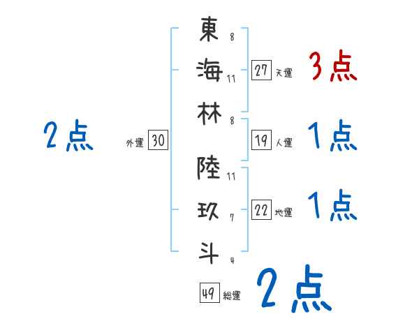 人運![]() | 東海林陸玖斗さんの人運は19画の1つ星!優れた才能を持ちますが、協調性が足りないことも。周りの人と協力する事を意識しましょう。 性格や才能などを表す2番目に重要な運勢です。人間関係や協調性、社会的な成功に影響します。主に20歳から50歳ぐらいまでの中年期の運勢を表します。 |