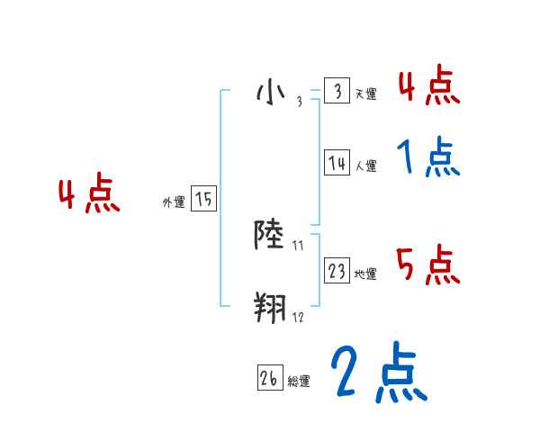 天運![]() | 小陸翔さんの天運は3画の4つ星!活動的で才能に恵まれ、多くの信頼を得る。希望に満ち成長する。 家系が持つ宿命的な運勢を表します。祖先から受け継いだ苗字ですので自分の力が及びません。家柄を象徴します。 |