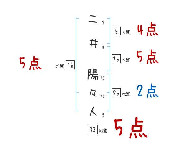 人運![]() | 二井陽々人さんの人運は16画の5つ星!人望が厚く大きく発展する。逆転成功が見える。 性格や才能などを表す2番目に重要な運勢です。人間関係や協調性、社会的な成功に影響します。主に20歳から50歳ぐらいまでの中年期の運勢を表します。 |