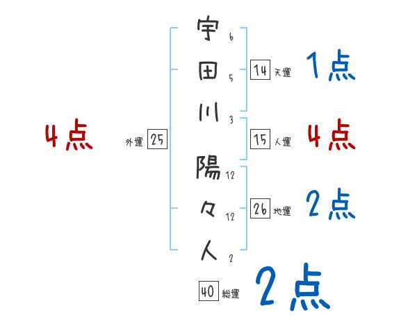 地運![]() | 宇田川陽々人さんの地運は26画の2つ星!波瀾万丈かも。信頼できる人を大事にしましょう。 個性を表す基礎的な運勢です。性格形成や対人関係、行動力など家庭環境に影響されます。主に誕生してから20歳くらいまでの若年期の運勢を表します。 |