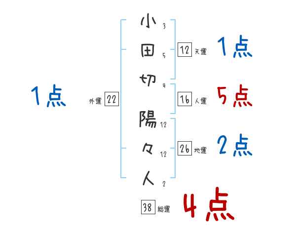 人運![]() | 小田切陽々人さんの人運は16画の5つ星!人望が厚く大きく発展する。逆転成功が見える。 性格や才能などを表す2番目に重要な運勢です。人間関係や協調性、社会的な成功に影響します。主に20歳から50歳ぐらいまでの中年期の運勢を表します。 |