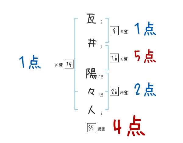 人運![]() | 瓦井陽々人さんの人運は16画の5つ星!人望が厚く大きく発展する。逆転成功が見える。 性格や才能などを表す2番目に重要な運勢です。人間関係や協調性、社会的な成功に影響します。主に20歳から50歳ぐらいまでの中年期の運勢を表します。 |