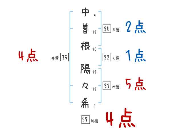 外運![]()  | 中曽根陽々希さんの外運は35画の4つ星!温厚な性格で感受性が高い。穏和な性格で人望が厚い。 生活面を象徴する運勢です。外部から受ける影響力を表し、結婚運、家庭運や職場、環境への順応性を表します。 |
