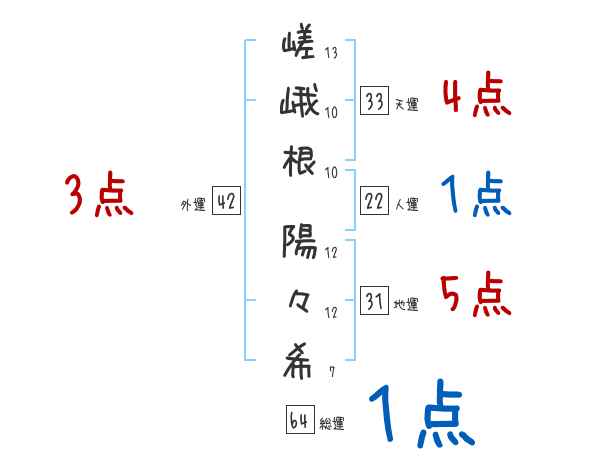 天運![]() | 嵯峨根陽々希さんの天運は33画の4つ星!権力志向でプライドが高い。勇気があり運を切り開き成功する。 家系が持つ宿命的な運勢を表します。祖先から受け継いだ苗字ですので自分の力が及びません。家柄を象徴します。 |