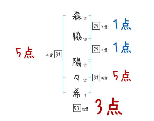 総運![]() | 森脇陽々希さんの総運は53画の3つ星!やや見栄っ張りで虚栄心がある。散財に注意。 あなたの人生を表す1番重要な運勢です。生涯を通じて影響する総合運となり、主に50歳以降の晩年期に影響を及ぼします。 |
