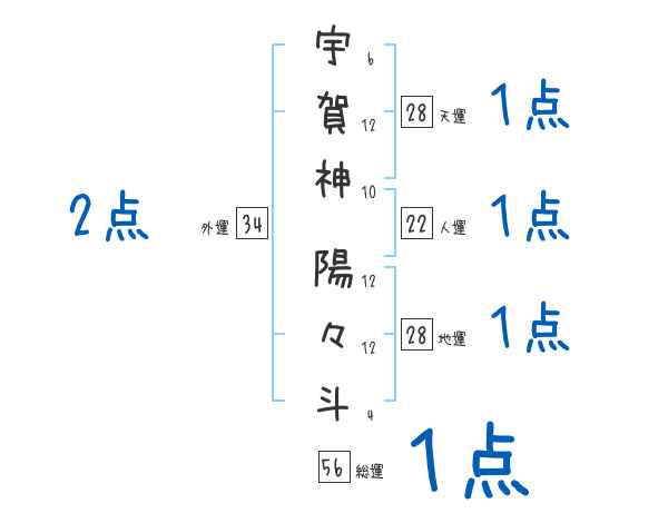 地運![]() | 宇賀神陽々斗さんの地運は28画の1つ星!家庭環境に注意。スポーツで活躍できる能力があるかも。 個性を表す基礎的な運勢です。性格形成や対人関係、行動力など家庭環境に影響されます。主に誕生してから20歳くらいまでの若年期の運勢を表します。 |