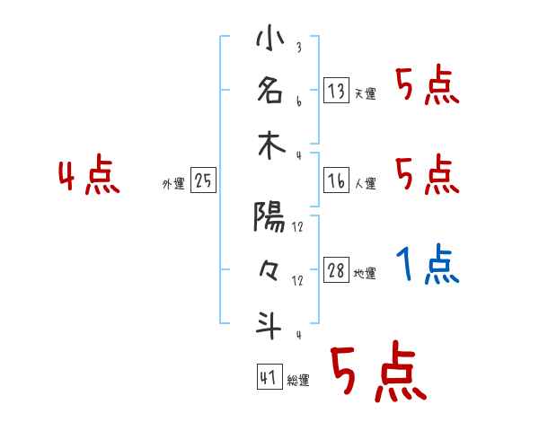 人運![]() | 小名木陽々斗さんの人運は16画の5つ星!人望が厚く大きく発展する。逆転成功が見える。 性格や才能などを表す2番目に重要な運勢です。人間関係や協調性、社会的な成功に影響します。主に20歳から50歳ぐらいまでの中年期の運勢を表します。 |