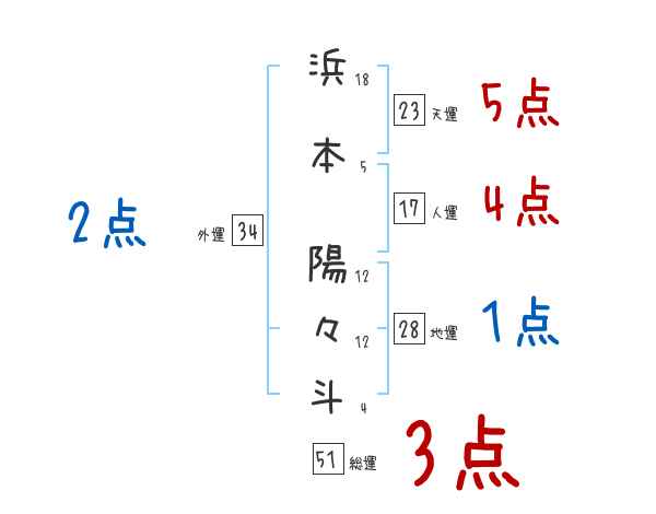 人運![]() | 浜本陽々斗さんの人運は17画の4つ星!積極的な行動力。地位を気づき財産を手に入れる。純粋な心と直感力。 性格や才能などを表す2番目に重要な運勢です。人間関係や協調性、社会的な成功に影響します。主に20歳から50歳ぐらいまでの中年期の運勢を表します。 |