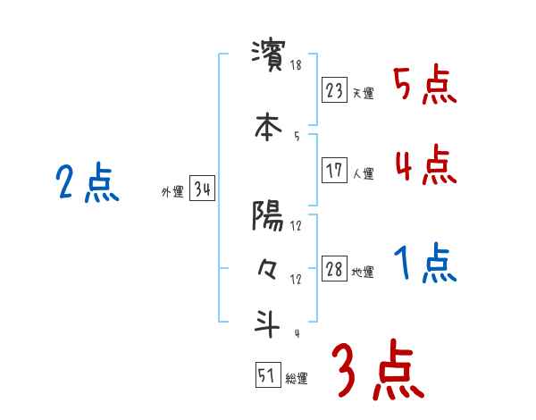 天運![]() | 濱本陽々斗さんの天運は23画の5つ星!想像力に優れ活力がある。一代で成功し名誉を手に入れる。 家系が持つ宿命的な運勢を表します。祖先から受け継いだ苗字ですので自分の力が及びません。家柄を象徴します。 |