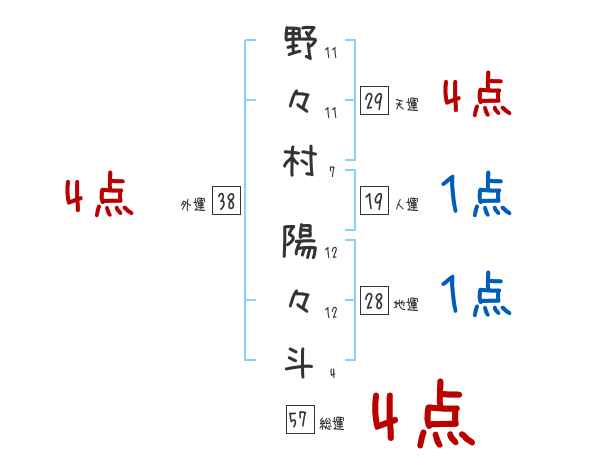 | 外運  | 野々村陽々斗さんの外運は38画の4つ星!温厚な性格で技術的な才能を発揮する。職人的な仕事に向いている。生活面を象徴する運勢です。外部から受ける影響力を表し、結婚運、家庭運や職場、環境への順応性を表します。 |