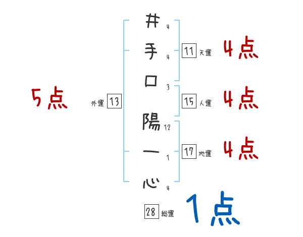 総運![]() | 井手口陽一心さんの総運は28画の1つ星!家庭環境に注意。スポーツで活躍できる能力があるかも。 あなたの人生を表す1番重要な運勢です。生涯を通じて影響する総合運となり、主に50歳以降の晩年期に影響を及ぼします。 |