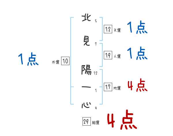 天運![]() | 北見陽一心さんの天運は12画の1つ星!簡単な失敗で諦めてしまいやすいかも。着実に行動すると良いでしょう。 家系が持つ宿命的な運勢を表します。祖先から受け継いだ苗字ですので自分の力が及びません。家柄を象徴します。 |