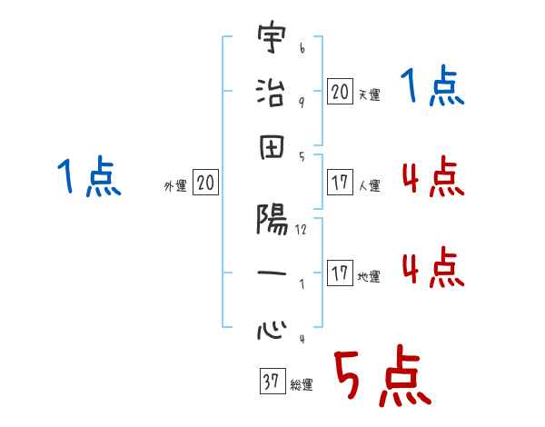 総運![]() | 宇治田陽一心さんの総運は37画の5つ星!努力家で順応性に優れる。現実的な考え方ができ忠実に物事をこなす。 あなたの人生を表す1番重要な運勢です。生涯を通じて影響する総合運となり、主に50歳以降の晩年期に影響を及ぼします。 |