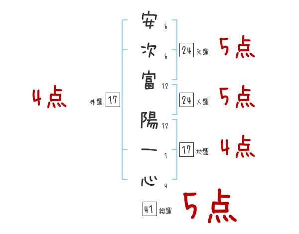 天運![]() | 安次富陽一心さんの天運は24画の5つ星!家庭運が良く順調な人生。金運にも恵まれる。 家系が持つ宿命的な運勢を表します。祖先から受け継いだ苗字ですので自分の力が及びません。家柄を象徴します。 |