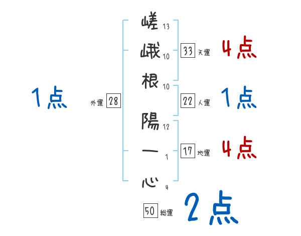 天運![]() | 嵯峨根陽一心さんの天運は33画の4つ星!権力志向でプライドが高い。勇気があり運を切り開き成功する。 家系が持つ宿命的な運勢を表します。祖先から受け継いだ苗字ですので自分の力が及びません。家柄を象徴します。 |