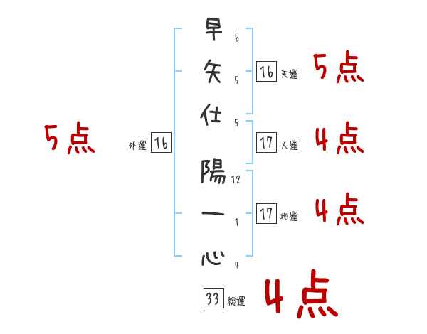 外運![]() | 早矢仕陽一心さんの外運は16画の5つ星!人望が厚く大きく発展する。逆転成功が見える。 生活面を象徴する運勢です。外部から受ける影響力を表し、結婚運、家庭運や職場、環境への順応性を表します。 |