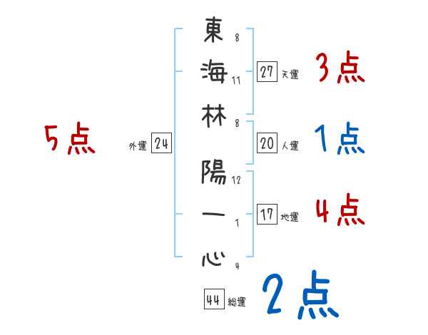 外運![]() | 東海林陽一心さんの外運は24画の5つ星!家庭運が良く順調な人生。金運にも恵まれる。 生活面を象徴する運勢です。外部から受ける影響力を表し、結婚運、家庭運や職場、環境への順応性を表します。 |