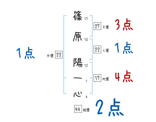 総運![]() | 篠原陽一心さんの総運は44画の2つ星!誠実で慎重な性格。物事を考えすぎないように注意しましょう。 あなたの人生を表す1番重要な運勢です。生涯を通じて影響する総合運となり、主に50歳以降の晩年期に影響を及ぼします。 |